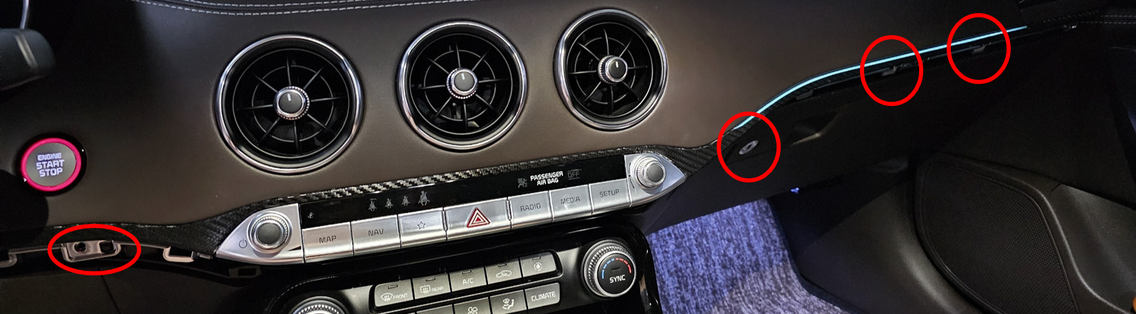 - 탈거한 센터페시아의 빨간색 동그라미 부분에 엔진 시동 버튼이 있는데, 나사 세개 풀고 커넥터도 탈거