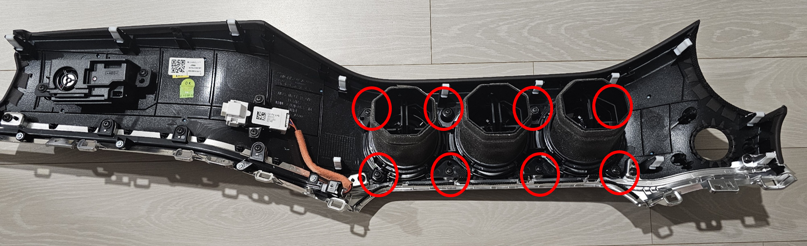 - 하단의 길쭉한 플라스틱을 탈거한 모습 : 플라스틱 커버가 탈거되어 센터페시아 나사 체결부가 노출된 상태(빨간 동그라미) 참고